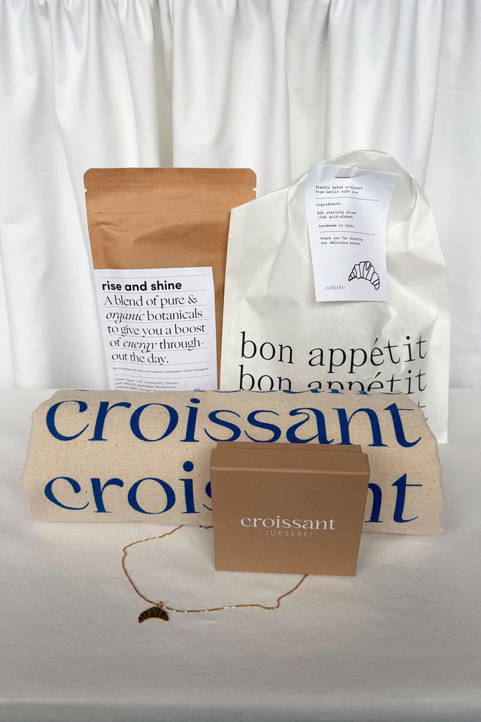 Our MORNING RITUAL bundle is designed to spark smiles, set the tone for the day and celebrate the beauty of small, sweet moments. Featuring our popular croissant necklace, our croissant tote bag and an uplifting Rise and Shine tea. This set brings warmth, whimsy and gentle encouragement to any morning. A delightful way to say: may your day begin with lightness, comfort and a touch of magic. Curious about our other gift sets? Click here
